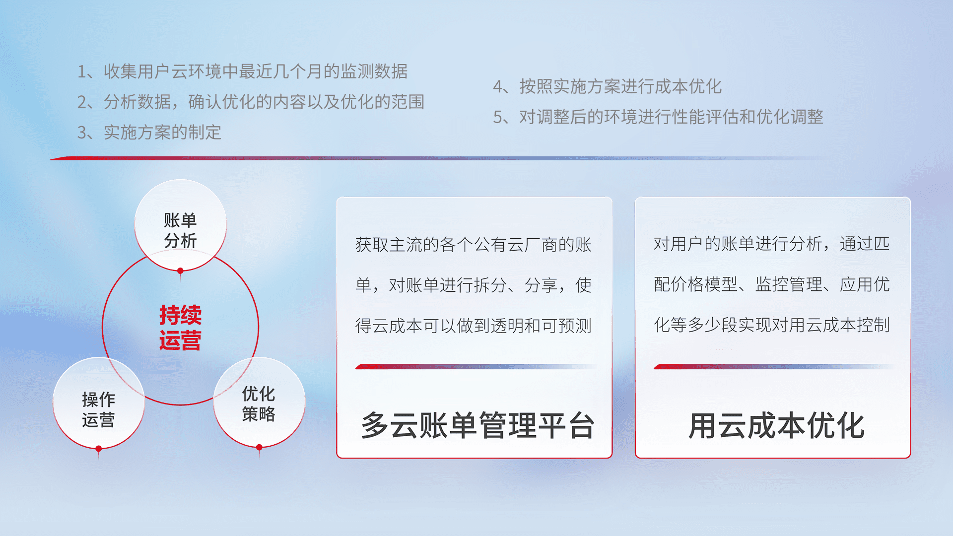 通过多云纳管,,,以统一的资源数据模型把客户的云资源进行抽象和封装,,进而实现对多云资源的统一操作,,,,保障云资源管理的可靠性、、稳定性与可用性。。。。量身定制化运维内容,,,,配置、、、、开发运维、、补丁管理、、备份、、、、监控、、认证和访问管理、、审计和日常巡检等,,,保障在用云过程中的可靠度,,,,稳定度以及高可用率。。